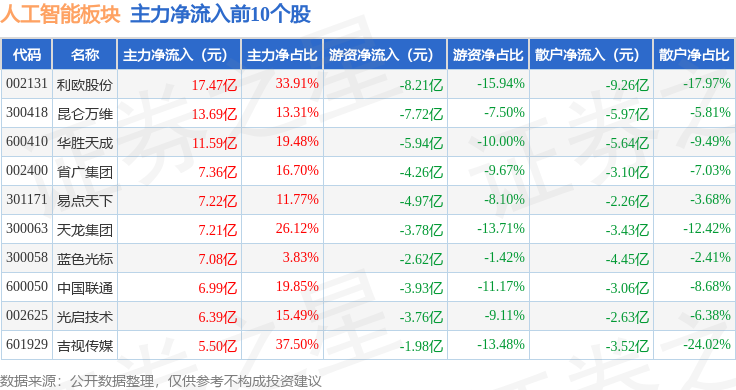 从资金流向上来看,当日人工智能板块主力资金净流入90.55亿元,游资资金净流出114.7亿元,散户资金净流入24.15亿元。人工智能板块个股资金流向见下表: