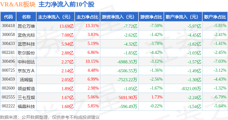 从资金流向上来看,当日VR&AR板块主力资金净流出13.31亿元,游资资金净流出17.44亿元,散户资金净流入30.75亿元。VR&AR板块个股资金流向见下表: