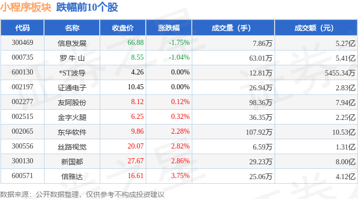 从资金流向上来看,当日小程序板块主力资金净流入18.31亿元,游资资金净流出9.02亿元,散户资金净流出9.29亿元。小程序板块个股资金流向见下表: