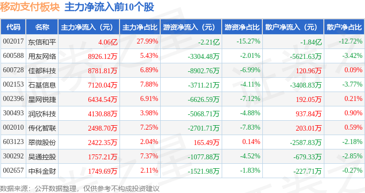 从资金流向上来看,当日移动支付板块主力资金净流出27.73亿元,游资资金净流入3.15亿元,散户资金净流入24.58亿元。移动支付板块个股资金流向见下表: