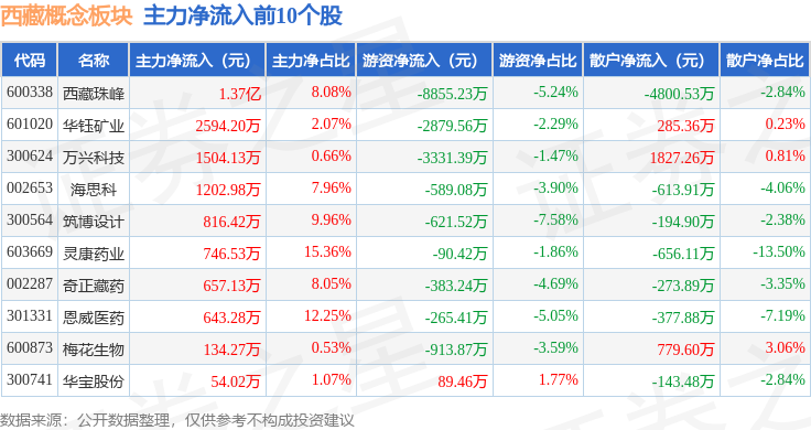 从资金流向上来看,当日西藏概念板块主力资金净流入7712.59万元,游资资金净流出1.66亿元,散户资金净流入8920.82万元。西藏概念板块个股资金流向见下表:
