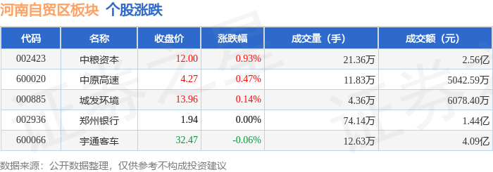 从资金流向上来看,当日河南自贸区板块主力资金净流出4809.59万元,游资资金净流入638.62万元,散户资金净流入4170.98万元。河南自贸区板块个股资金流向见下表: