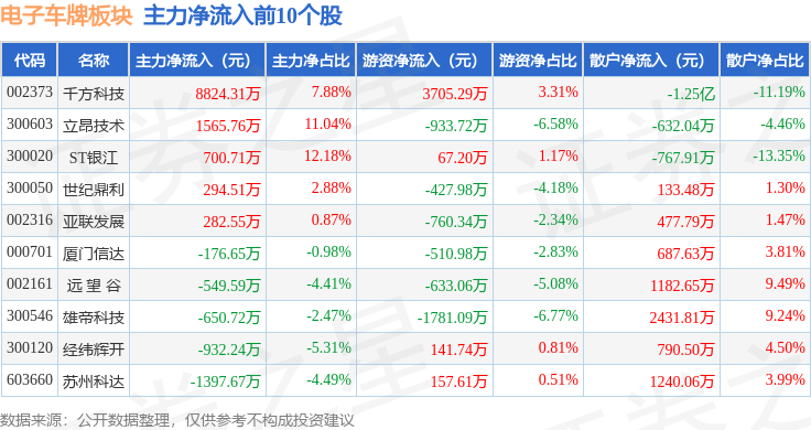 从资金流向上来看,当日电子车牌板块主力资金净流出2.1亿元,游资资金净流出1051.79万元,散户资金净流入2.2亿元。电子车牌板块个股资金流向见下表: