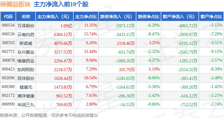 从资金流向上来看,当日保健品板块主力资金净流出5.13亿元,游资资金净流入3422.81万元,散户资金净流入4.79亿元。保健品板块个股资金流向见下表: