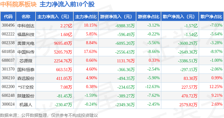 从资金流向上来看,当日中科院系板块主力资金净流入2829.02万元,游资资金净流入6744.32万元,散户资金净流出9573.35万元。中科院系板块个股资金流向见下表: