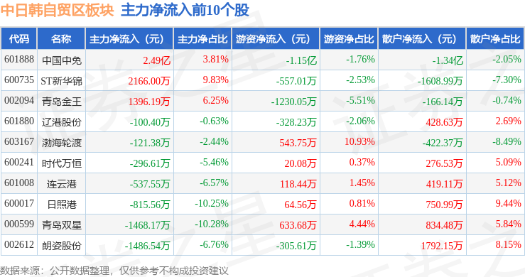 从资金流向上来看,当日中日韩自贸区板块主力资金净流入2.13亿元,游资资金净流出1.38亿元,散户资金净流出7431.6万元。中日韩自贸区板块个股资金流向见下表:
