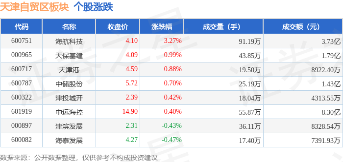 从资金流向上来看,当日天津自贸区板块主力资金净流入4848.6万元,游资资金净流出5692.32万元,散户资金净流入843.72万元。天津自贸区板块个股资金流向见下表: