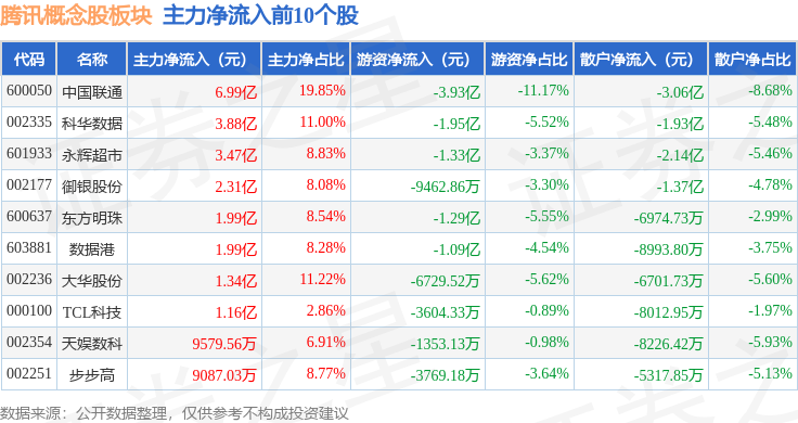 从资金流向上来看,当日腾讯概念股板块主力资金净流入20.51亿元,游资资金净流出15.83亿元,散户资金净流出4.68亿元。腾讯概念股板块个股资金流向见下表: