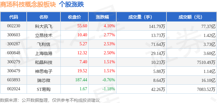 证券之星消息,1月9日商汤科技概念股板块较上一交易日上涨1.98%,科大讯飞领涨。当日上证指数报收于4120.43,上涨0.92%。深证成指报收于14120.15,上涨1.15%。商汤科技概念股板块个股涨跌见下表: