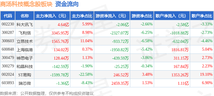 从资金流向上来看,当日商汤科技概念股板块主力资金净流入3.62亿元,游资资金净流出2.35亿元,散户资金净流出1.27亿元。商汤科技概念股板块个股资金流向见下表: