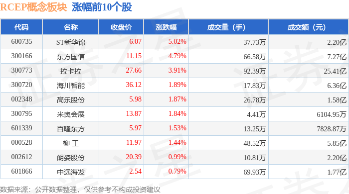 从资金流向上来看,当日RCEP概念板块主力资金净流出1.23亿元,游资资金净流出1.42亿元,散户资金净流入2.64亿元。RCEP概念板块个股资金流向见下表: