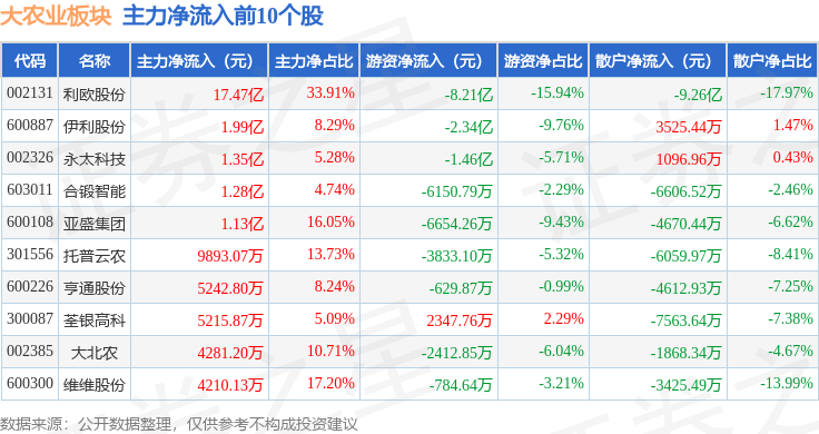 从资金流向上来看,当日大农业板块主力资金净流出1.46亿元,游资资金净流出15.72亿元,散户资金净流入17.18亿元。大农业板块个股资金流向见下表: