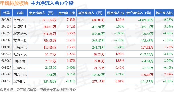 从资金流向上来看,当日甲烷排放板块主力资金净流出1.2亿元,游资资金净流出9107.68万元,散户资金净流入2.11亿元。甲烷排放板块个股资金流向见下表: