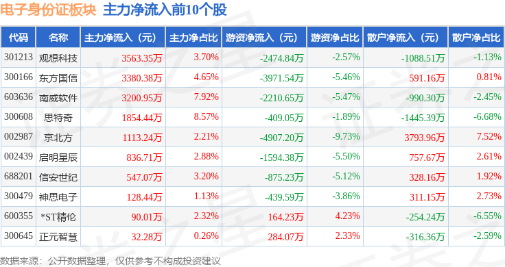 从资金流向上来看,当日电子身份证板块主力资金净流出5.22亿元,游资资金净流出2.06亿元,散户资金净流入7.28亿元。电子身份证板块个股资金流向见下表: