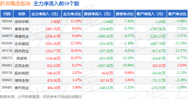 从资金流向上来看,当日肝炎概念板块主力资金净流入2.51亿元,游资资金净流出2.45亿元,散户资金净流出601.3万元。肝炎概念板块个股资金流向见下表: