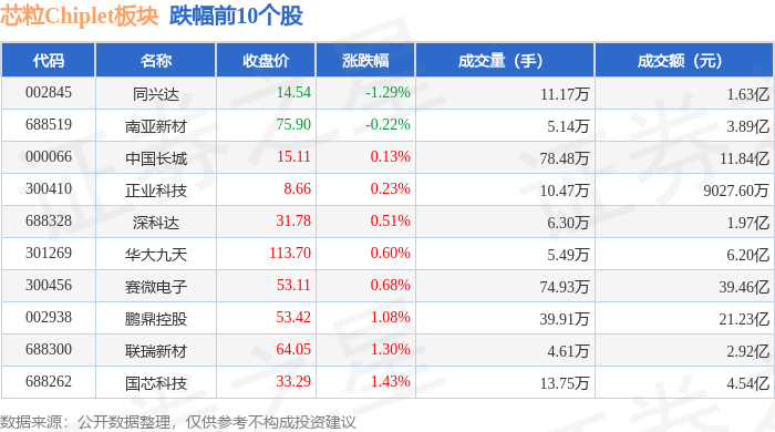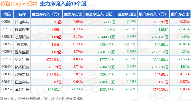 从资金流向上来看,当日芯粒Chiplet板块主力资金净流入6.5亿元,游资资金净流出8.84亿元,散户资金净流入2.34亿元。芯粒Chiplet板块个股资金流向见下表: