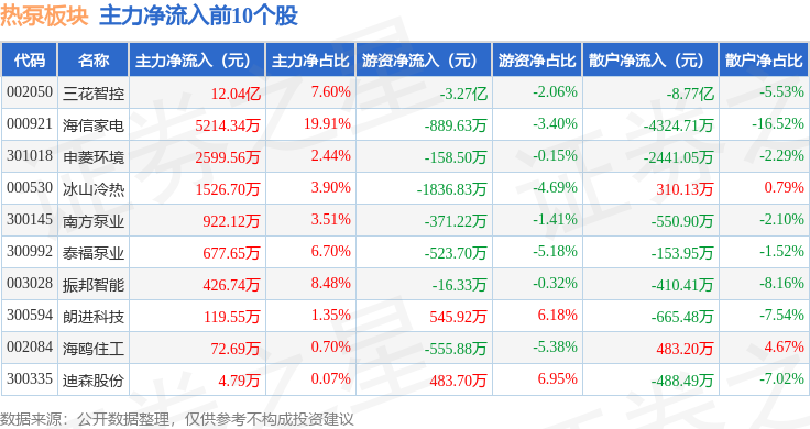 从资金流向上来看,当日热泵板块主力资金净流出7.36亿元,游资资金净流出1.51亿元,散户资金净流入8.87亿元。热泵板块个股资金流向见下表:
