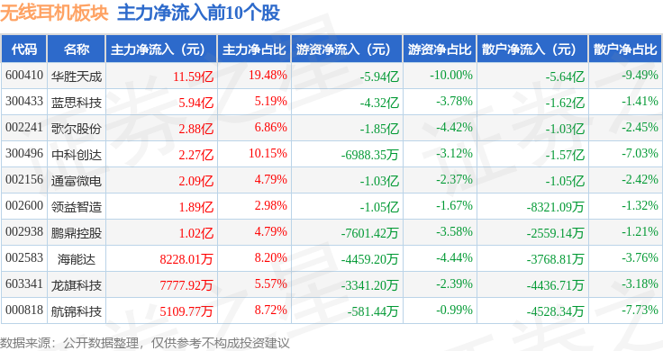 从资金流向上来看,当日无线耳机板块主力资金净流出14.44亿元,游资资金净流出2.72亿元,散户资金净流入17.16亿元。无线耳机板块个股资金流向见下表: