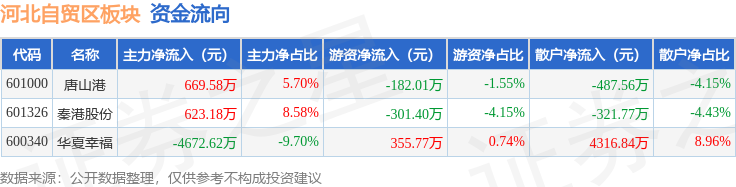 从资金流向上来看,当日河北自贸区板块主力资金净流出3379.86万元,游资资金净流出127.65万元,散户资金净流入3507.5万元。河北自贸区板块个股资金流向见下表: