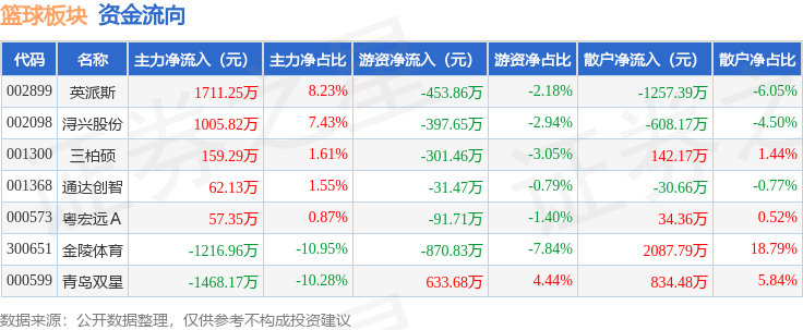 从资金流向上来看,当日篮球板块主力资金净流入310.71万元,游资资金净流出1513.29万元,散户资金净流入1202.58万元。篮球板块个股资金流向见下表: