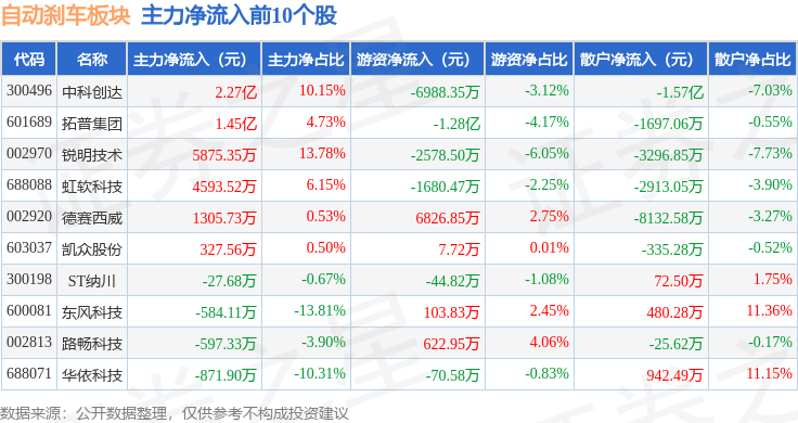 从资金流向上来看,当日自动刹车板块主力资金净流出33.43亿元,游资资金净流入7.19亿元,散户资金净流入26.24亿元。自动刹车板块个股资金流向见下表: