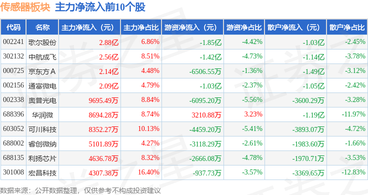 从资金流向上来看,当日传感器板块主力资金净流出32.23亿元,游资资金净流出3.36亿元,散户资金净流入35.59亿元。传感器板块个股资金流向见下表: