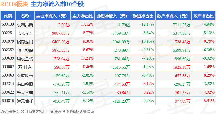 从资金流向上来看,当日REITs板块主力资金净流入2.99亿元,游资资金净流出3.23亿元,散户资金净流入2409.3万元。REITs板块个股资金流向见下表: