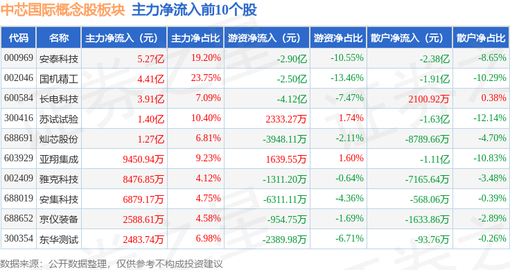 从资金流向上来看,当日中芯国际概念股板块主力资金净流出10.67亿元,游资资金净流入3618.6万元,散户资金净流入10.31亿元。中芯国际概念股板块个股资金流向见下表: