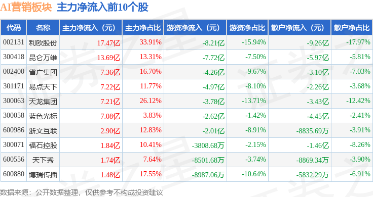 从资金流向上来看,当日AI营销板块主力资金净流入72.58亿元,游资资金净流出37.67亿元,散户资金净流出34.91亿元。AI营销板块个股资金流向见下表: