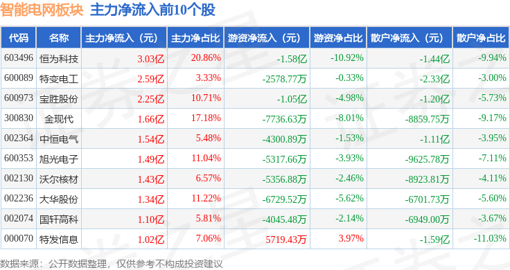 从资金流向上来看,当日智能电网板块主力资金净流出26.44亿元,游资资金净流出9210.58万元,散户资金净流入27.36亿元。智能电网板块个股资金流向见下表: