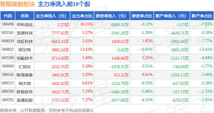 从资金流向上来看,当日智能座舱板块主力资金净流出13.45亿元,游资资金净流出3.57亿元,散户资金净流入17.03亿元。智能座舱板块个股资金流向见下表:
