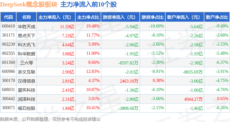 从资金流向上来看,当日DeepSeek概念股板块主力资金净流入54.67亿元,游资资金净流出34.65亿元,散户资金净流出20.02亿元。DeepSeek概念股板块个股资金流向见下表:
