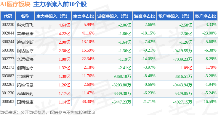 从资金流向上来看,当日AI医疗板块主力资金净流入18.93亿元,游资资金净流出19.37亿元,散户资金净流入4370.52万元。AI医疗板块个股资金流向见下表: