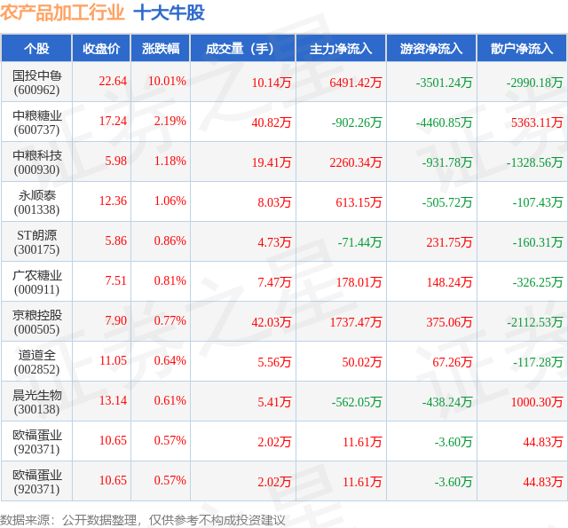 个股表现方面,农产品加工行业当日领涨股为国投中鲁(600962),该股当日报收22.64,上涨10.01%,成交量10.14万,主力资金净流入6491.42万元。中粮糖业(600737)以上涨2.19%紧随其后,该股当日成交量40.82万,主力资金净流出902.26万元。除此之外,中粮科技(000930)、永顺泰(001338)、ST朗源(300175)均进入当日牛股之列。具体个股列表见下表: