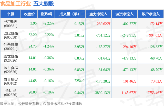 个股表现方面,食品加工行业当日领跌股为*ST春天(600381),该股当日报收3.96,下跌2.22%,成交量9.15万,主力资金净流入230.62万元。巴比食品(605338)以下跌2.22%紧随其后,该股当日成交量3.81万,主力资金净流出751.12万元。除此之外,仙乐健康(300791)、盖世食品(920826)、盖世食品(920826)均进入当日熊股之列。具体个股列表见下表: