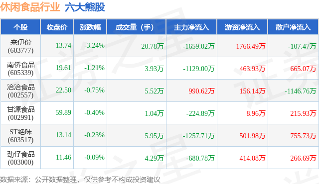 个股表现方面,休闲食品行业当日领跌股为来伊份(603777),该股当日报收13.74,下跌3.24%,成交量20.78万,主力资金净流出1659.02万元。南侨食品(605339)以下跌1.21%紧随其后,该股当日成交量3.93万,主力资金净流出1129.0万元。除此之外,洽洽食品(002557)、甘源食品(002991)、ST绝味(603517)均进入当日熊股之列。具体个股列表见下表: