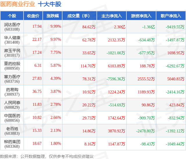 个股表现方面,医药商业行业当日领涨股为润达医疗(603108),该股当日报收17.94,上涨9.99%,成交量84.62万,主力资金净流入2.3亿元。华人健康(301408)以上涨9.97%紧随其后,该股当日成交量62.78万,主力资金净流入2132.35万元。除此之外,漱玉平民(301017)、重药控股(000950)、塞力医疗(603716)均进入当日牛股之列。具体个股列表见下表:
