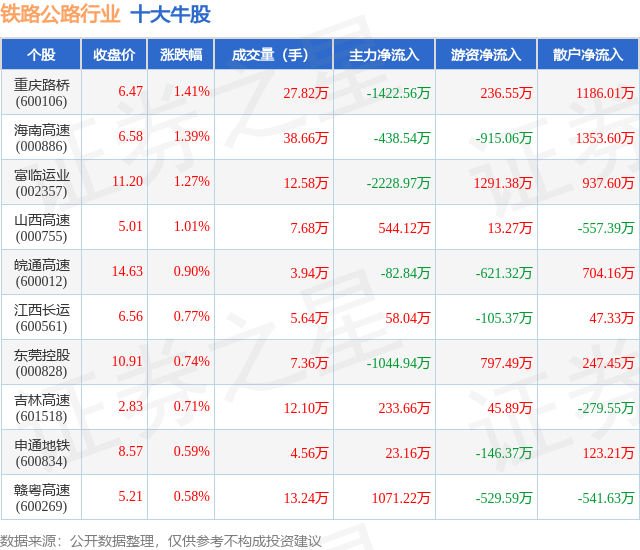 个股表现方面,铁路公路行业当日领涨股为重庆路桥(600106),该股当日报收6.47,上涨1.41%,成交量27.82万,主力资金净流出1422.56万元。海南高速(000886)以上涨1.39%紧随其后,该股当日成交量38.66万,主力资金净流出438.54万元。除此之外,富临运业(002357)、山西高速(000755)、皖通高速(600012)均进入当日牛股之列。具体个股列表见下表: