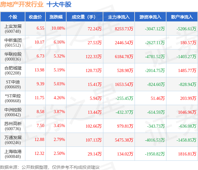 个股表现方面,房地产开发行业当日领涨股为上实发展(600748),该股当日报收6.55,上涨10.08%,成交量72.24万,主力资金净流入8253.73万元。中新集团(601512)以上涨6.16%紧随其后,该股当日成交量27.53万,主力资金净流入2446.54万元。除此之外,华联控股(000036)、合肥城建(002208)、ST中迪(000609)均进入当日牛股之列。具体个股列表见下表: