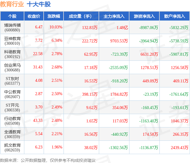 个股表现方面,教育行业当日领涨股为博瑞传播(600880),该股当日报收6.47,上涨10.03%,成交量132.83万,主力资金净流入1.48亿元。豆神教育(300010)以上涨6.34%紧随其后,该股当日成交量222.72万,主力资金净流入9703.53万元。除此之外,科德教育(300192)、创业黑马(300688)、ST东时(603377)均进入当日牛股之列。具体个股列表见下表:
