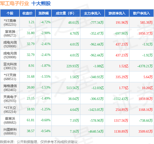 个股表现方面,军工电子行业当日领跌股为*ST奥维(002231),该股当日报收1.21,下跌4.72%,成交量48.61万,主力资金净流出777.34万元。富吉瑞(688272)以下跌2.9%紧随其后,该股当日成交量4.7万,主力资金净流出352.47万元。除此之外,成电光信(920008)、成电光信(920008)、亚光科技(300123)均进入当日熊股之列。具体个股列表见下表:
