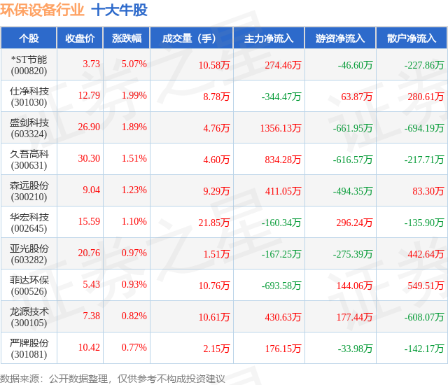 个股表现方面,环保设备行业当日领涨股为*ST节能(000820),该股当日报收3.73,上涨5.07%,成交量10.58万,主力资金净流入274.46万元。仕净科技(301030)以上涨1.99%紧随其后,该股当日成交量8.78万,主力资金净流出344.47万元。除此之外,盛剑科技(603324)、久吾高科(300631)、森远股份(300210)均进入当日牛股之列。具体个股列表见下表: