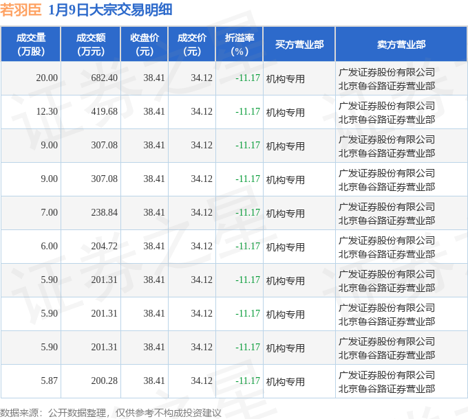 证券之星消息,1月9日若羽臣发生大宗交易,交易数据如下: