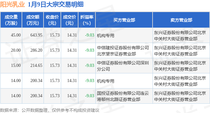 证券之星消息,1月9日阳光乳业发生大宗交易,交易数据如下: