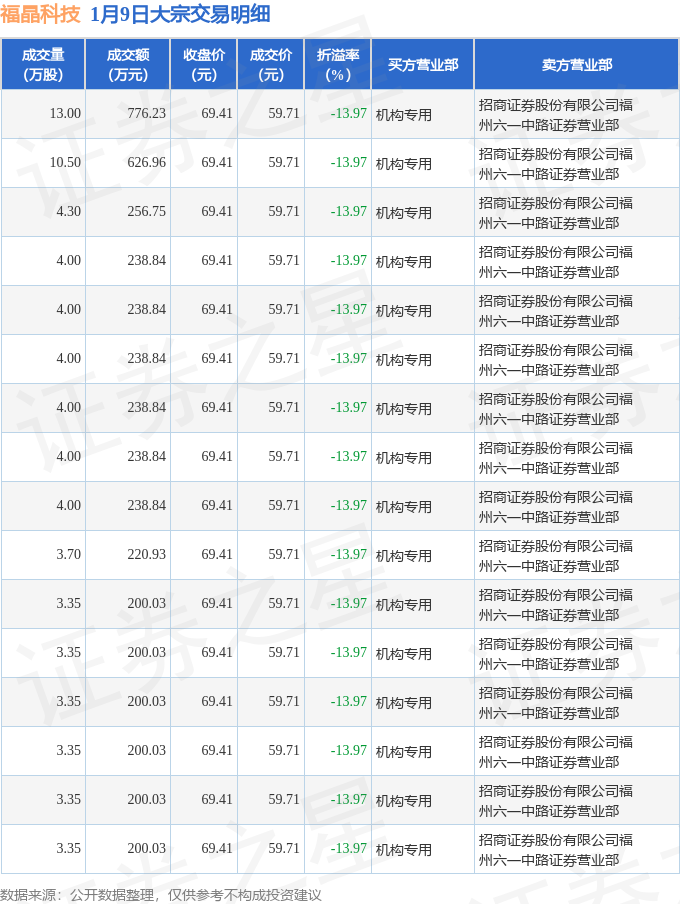 证券之星消息,1月9日福晶科技发生大宗交易,交易数据如下: