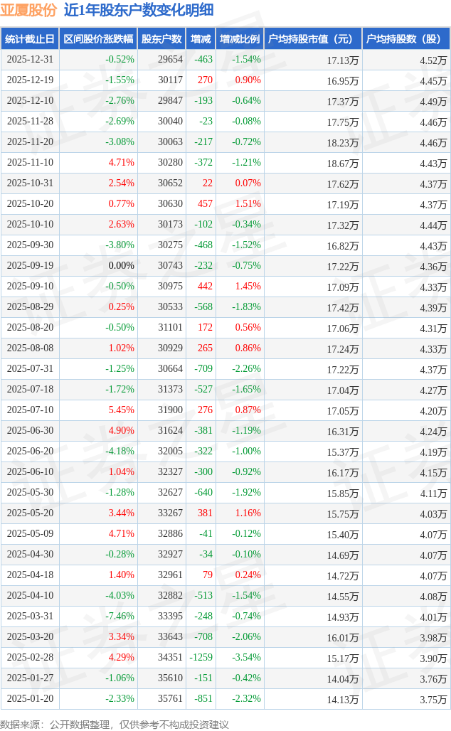 从股价来看,2025年12月19日至2025年12月31日,亚厦股份区间跌幅为0.52%,在此期间股东户数减少463.0户,减幅为1.54%。