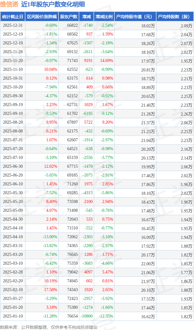 从股价来看,2025年12月19日至2025年12月31日,维信诺区间跌幅为0.69%,在此期间股东户数减少1740.0户,减幅为2.54%。