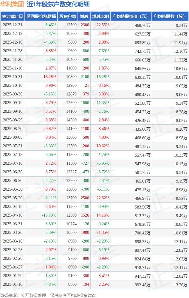 从股价来看,2025年12月19日至2025年12月31日,华利集团区间跌幅为8.46%,在此期间股东户数增加2300.0户,增幅为22.55%。