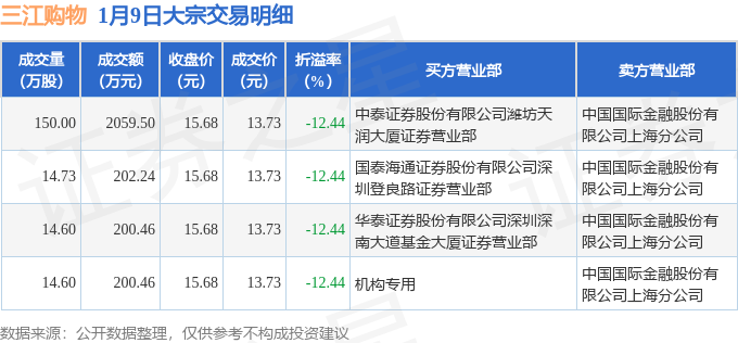 证券之星消息,1月9日三江购物发生大宗交易,交易数据如下: