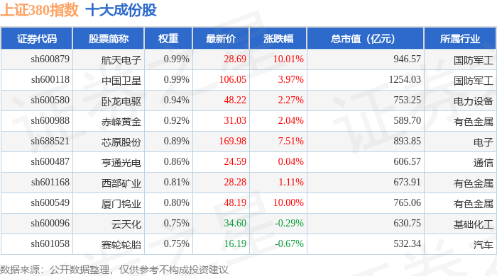 上证380(000009)指数十大成份股详情如下: